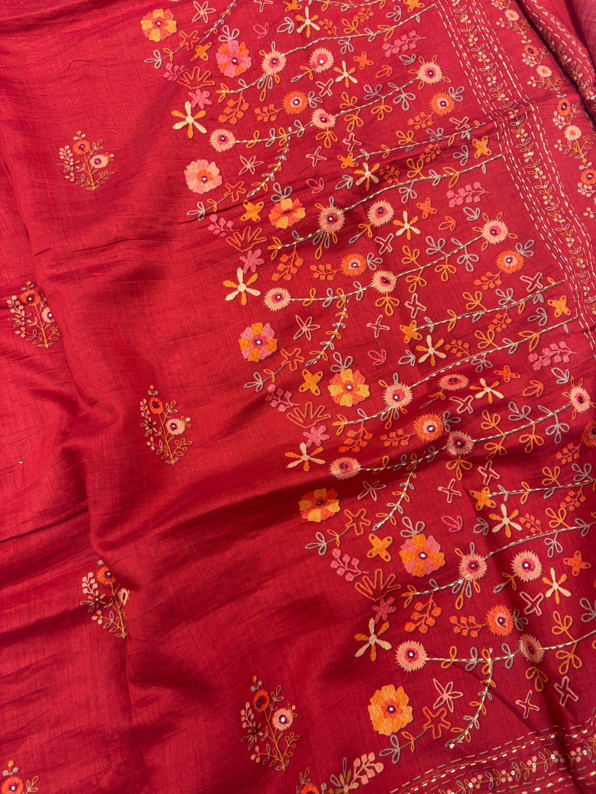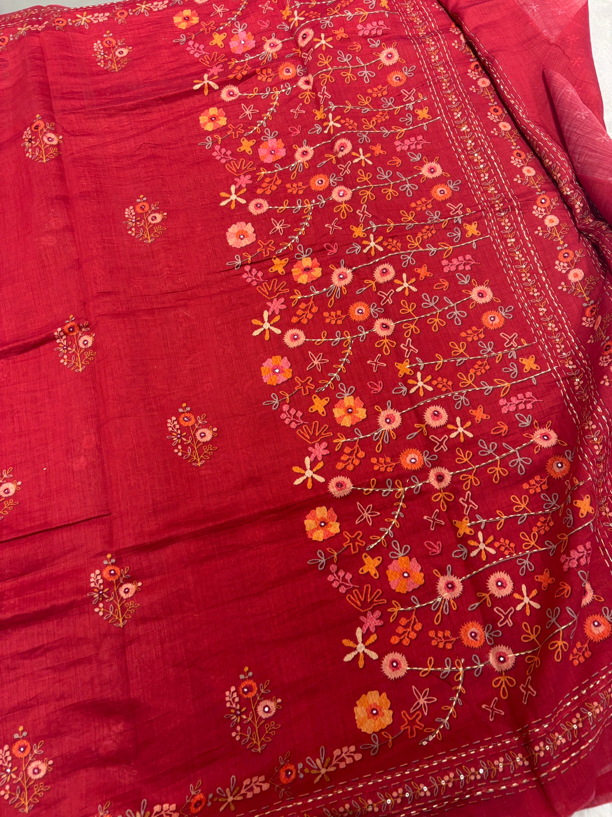 Rust Floral Embroidery Mul Cotton Saree-M101