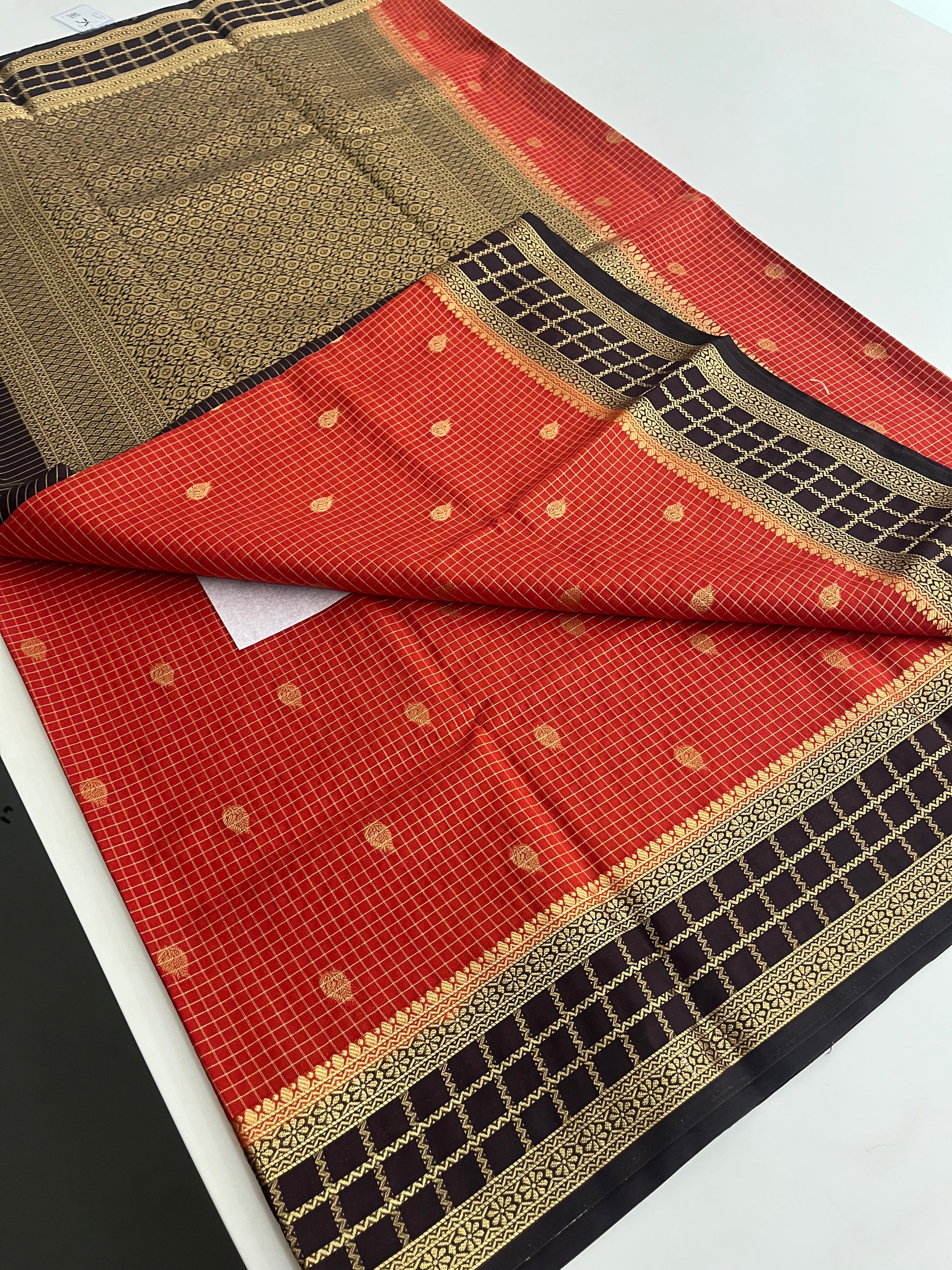 Rust orange with deep wine checks Banarasi Chinnon silk
